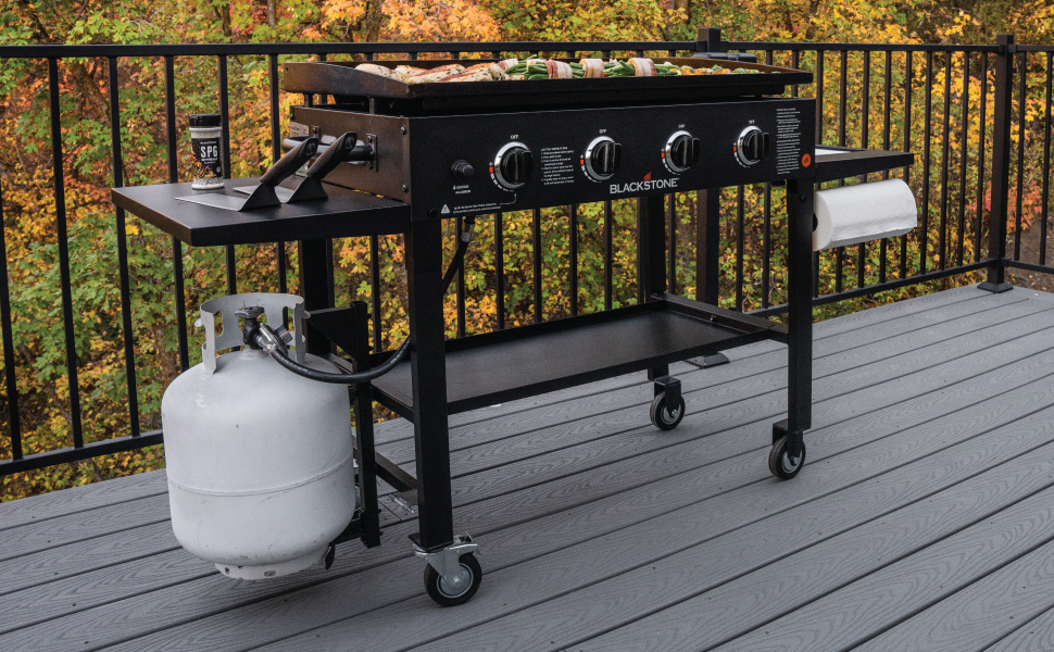 - NEW FEATURES - This unit comes equipped with Blackstone's new and improved side shelf giving the user a removable cutting board, convenient paper towel holder, and strategically placed trash bag hooks. PLUS Blackstone's new rear grease management system to help eliminate mess.