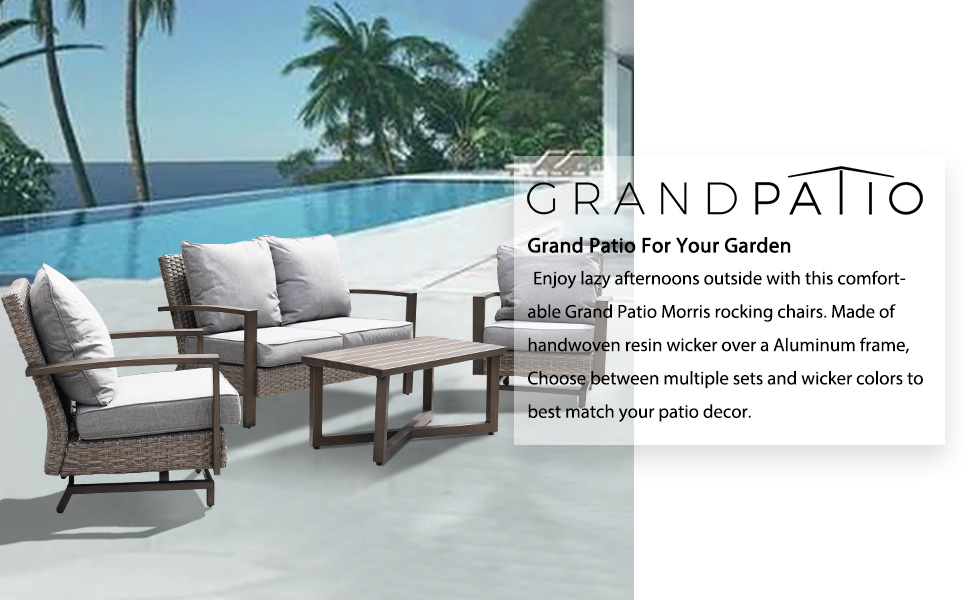 【ULTIMATE COMFORT】Upgraded Grand Patio set has 2 stationary rockers with integrated rocker, which you can slightly shake the chair back and forth in ultimate comfort. A 20% wider seat combined with thick olefin cushions provide enough space for more comfortable, keep your back much more relaxed.