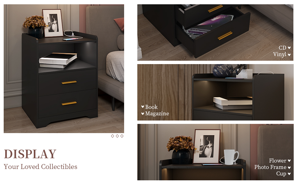 【Furniture】Black Nightstand with Charging Station, Night Stands with 2 Drawers, Smart Nightstand Bedside Table Led