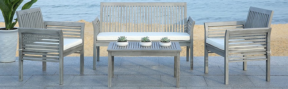 Clean and contemporary, the Carson 4-piece outdoor set recalls the simplicity of Danish furniture design. Masterfully crafted of sustainable acacia wood in a grey wash finish, the set comes with beige all-weather seat cushions for easy-care comfort..Care Instructions is Store outdoor furniture indoors or cover when not in use. Dust regularly with small brush or vacuumCustomer questions & answers