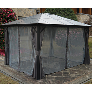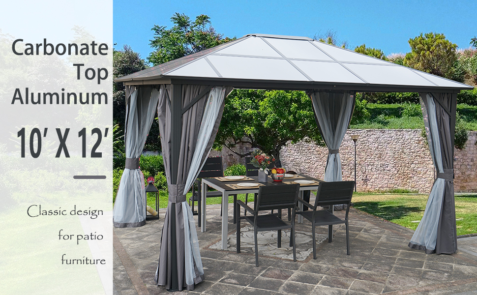 Kozyard 10ftx12ft Polycarbonate Top Aluminum Permanent Gazebo with Layers SidewallsThe Edward Aluminum Gazebo elevates your backyard, or other outdoor space, adding an element of comfort and sophistication that’s certain to impress your guests.The 6mm thick polycarbonate sheet cover provides protection against the sun's harmful UV rays to keep you in a comfortable cool space on hot sunny days.The polycarbonate sheet is charcoal gray color, beautiful and modern color matching with other decorations in your home.Specifications: