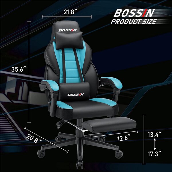 Bossin gaming chair is all designed for your every need! The gaming chair matches all locations.360° swivel and smooth racing caster wheels for mobility; 90°-180° reclining for working, gaming, reading, or napping; retractable footrest for relaxing; Adjustable seat height, 400 lbs. capacity; head pillow and lumbar pillow for all body shapes. Winged back provides multi-point body contact to share the pressure, and save your spine and lumbar with ergonomic back and massage support. Lean your legs more comfortably with a bucket seat design, the side wings frame has been thinned and contains more soft filling. Alloy frame covered in quality PU leather and 6 inches of high-density foam for comfy. It is stable enough to serve for years.
