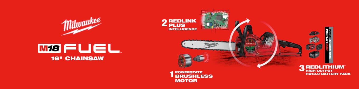 16 in. Oregon bar and chainPOWERSTATE brushless motor provides the power and performance of a gas engine up to 40 ccREDLITHIUM high output HD 12.0 Ah battery pack provides 50% more power and runs 50% cooler versus standard REDLITHIUM HD packsVariable speed trigger for full controlDual-stud for improved bar and chain retentionAutomatic oiler for proper chain lubrication and increased productivityOnboard storage for screnchPart of the M18 system, featuring over 250 plus tools3-year tool and 3-year battery warrantyIncludes: (1) M18 FUEL 16 in. chainsaw, (1) REDLITHIUM high output HD12.0 battery pack, (1) M18 and M12 rapid charger, (1) 16 in. Oregon bar and chain, (1) scrunch