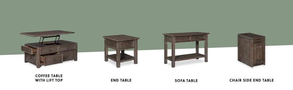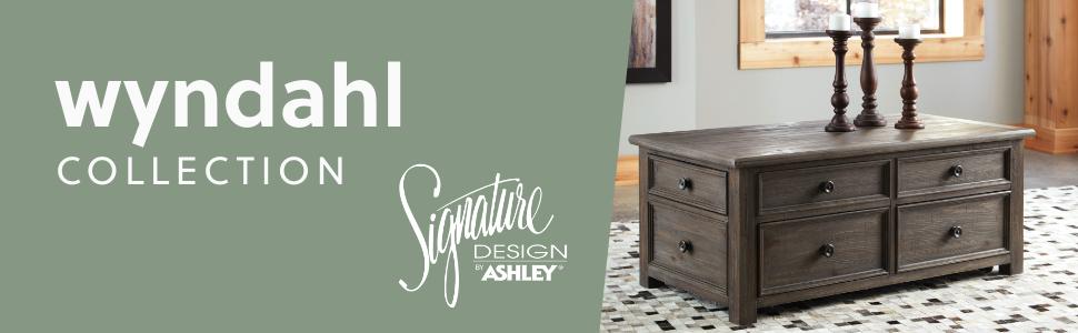 Inspired by heavy and hearty lodge-style furnishings from days gone by, the Wyndahl lift top coffee table brings the past brilliantly into the present. Distinctive details include robust mouldings, raised drawer fronts for rich dimension and a distressed aged pine color finish with light wire-brushed texture that’s pure artistry. The table’s spring lift top—perfect for impromptu meals and laptop work—makes this yesteryear-inspired piece made for the here and now.