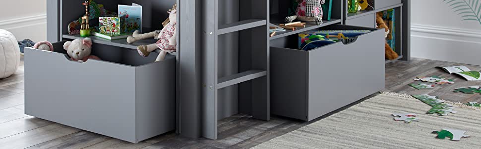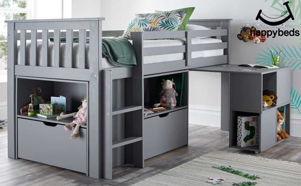The Milo Mid Sleeper bed is a modern sleep station with beautiful grey or white finish. This cosy cabin bed will be the perfect addition to your child's room. It features a pull-out desk, large shelves and storage spaces which will help your child to be organized. The shelf unit is not attached to the bed frame and can be placed separately in the room. The bed is constructed strong and sturdy form quality wood. The ladder and the desk casters can be placed on either the left or the right side depending on the room requirements. The head and foot end are open slatted and there are guard rails to both side. The bed comes flat packed for ease of delivery and storage. Easy self assembly.