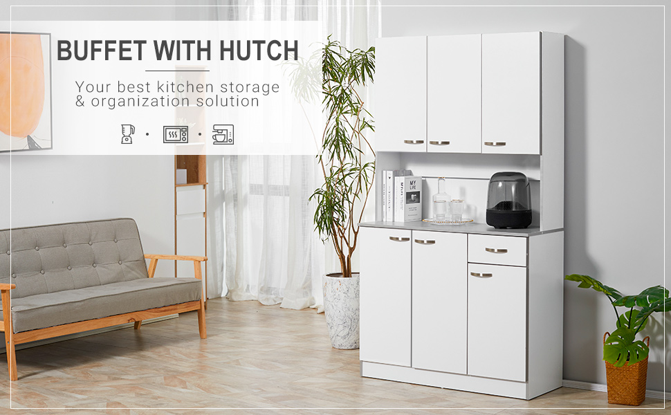 Creating a stylish storage option has never been so easy! This modern kitchen buffet server cabinet from HOMCOM fits nicely with any decor and can be used in the kitchen, pantry, closet, garage to create stylish additional storage. White coated engineered wood provides an easy to clean, smooth surface that will help keep your sideboard with hutch clean and sanitary.